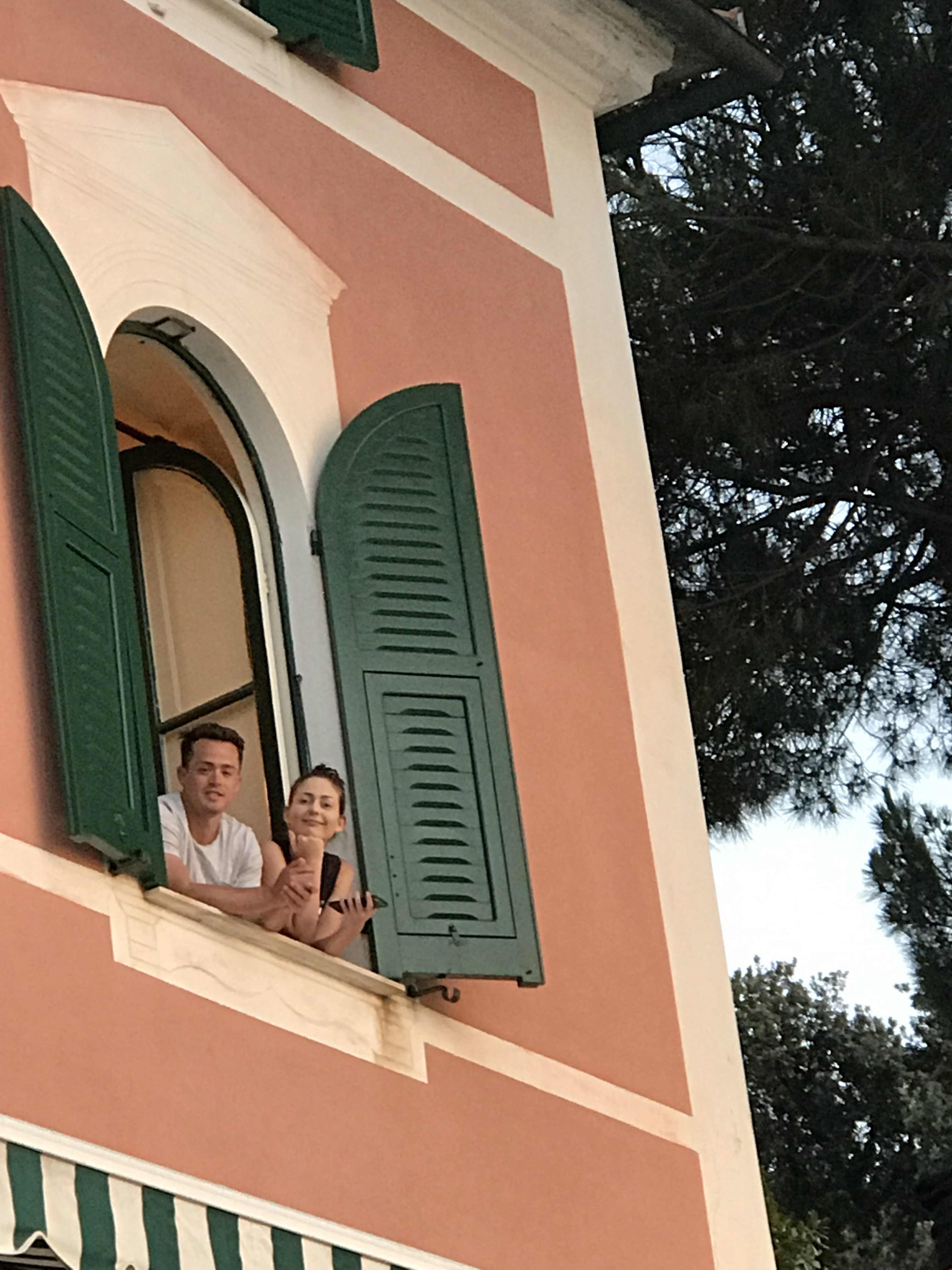 Dom and Alix in their bedroom overlooking the Ligurian sea.