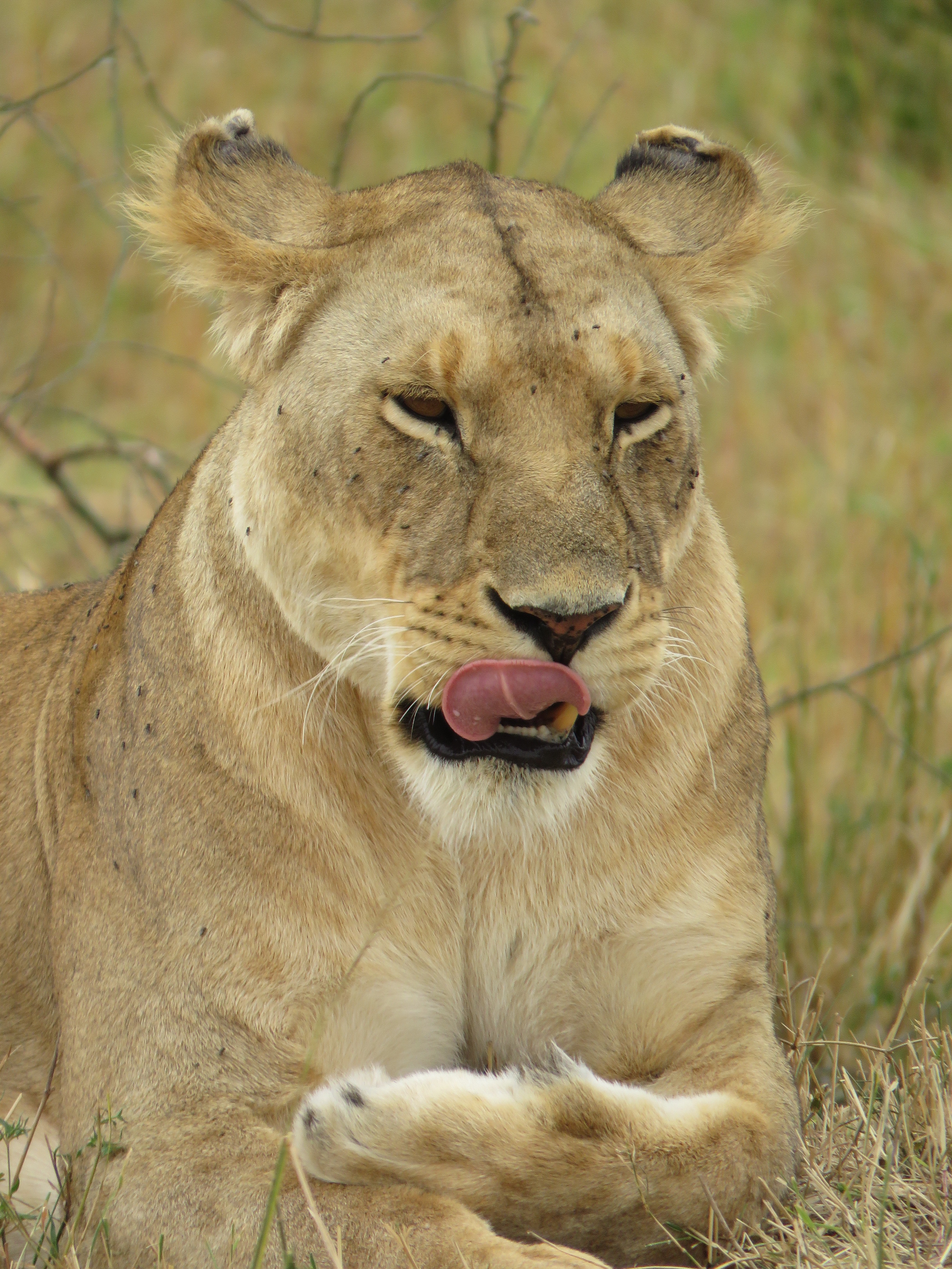 Here is a lioness cleaning herself