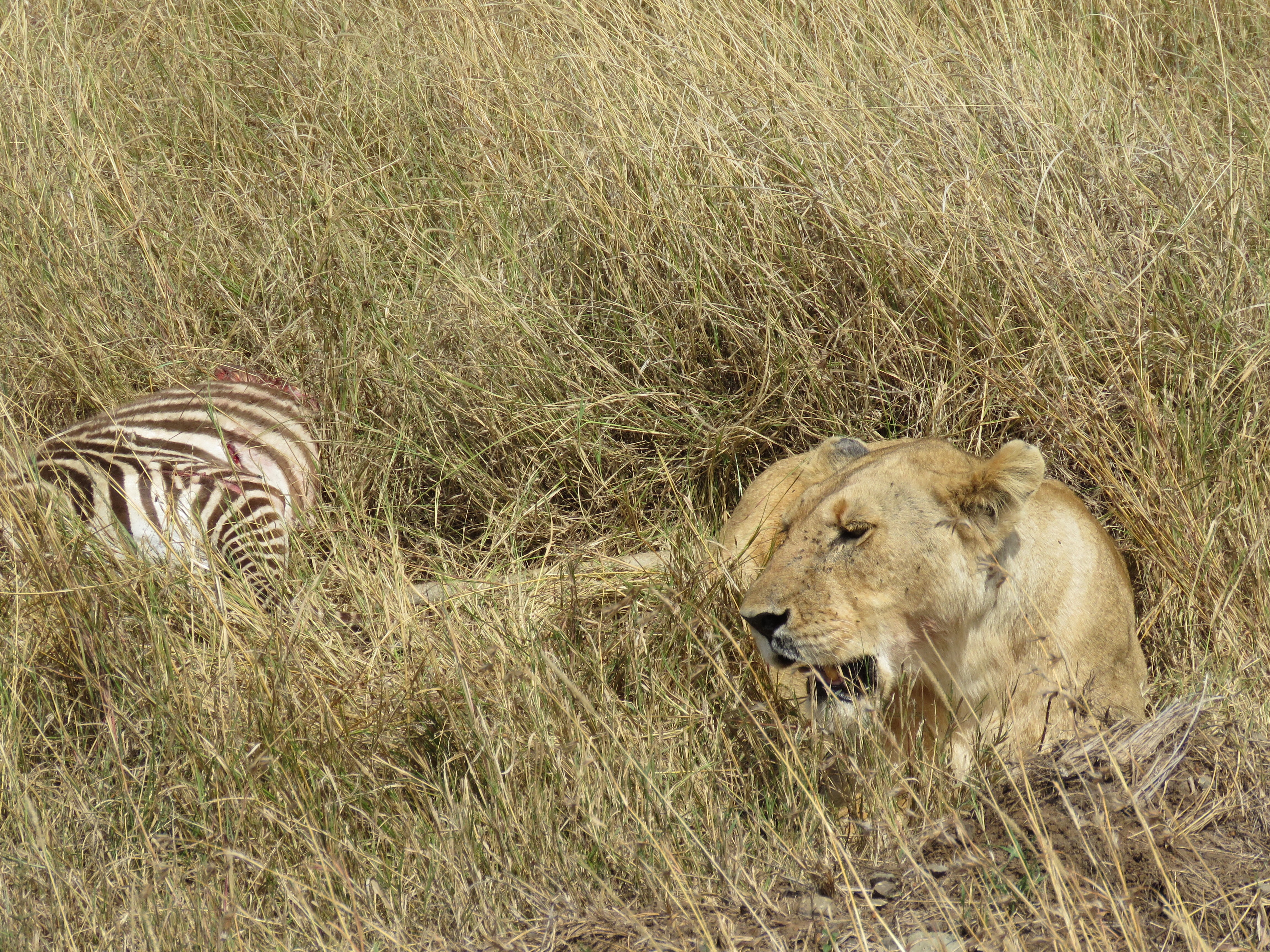 there is another female protecting her prey; a zebra- they’re both guarding the prey for the male lion who’s not far .