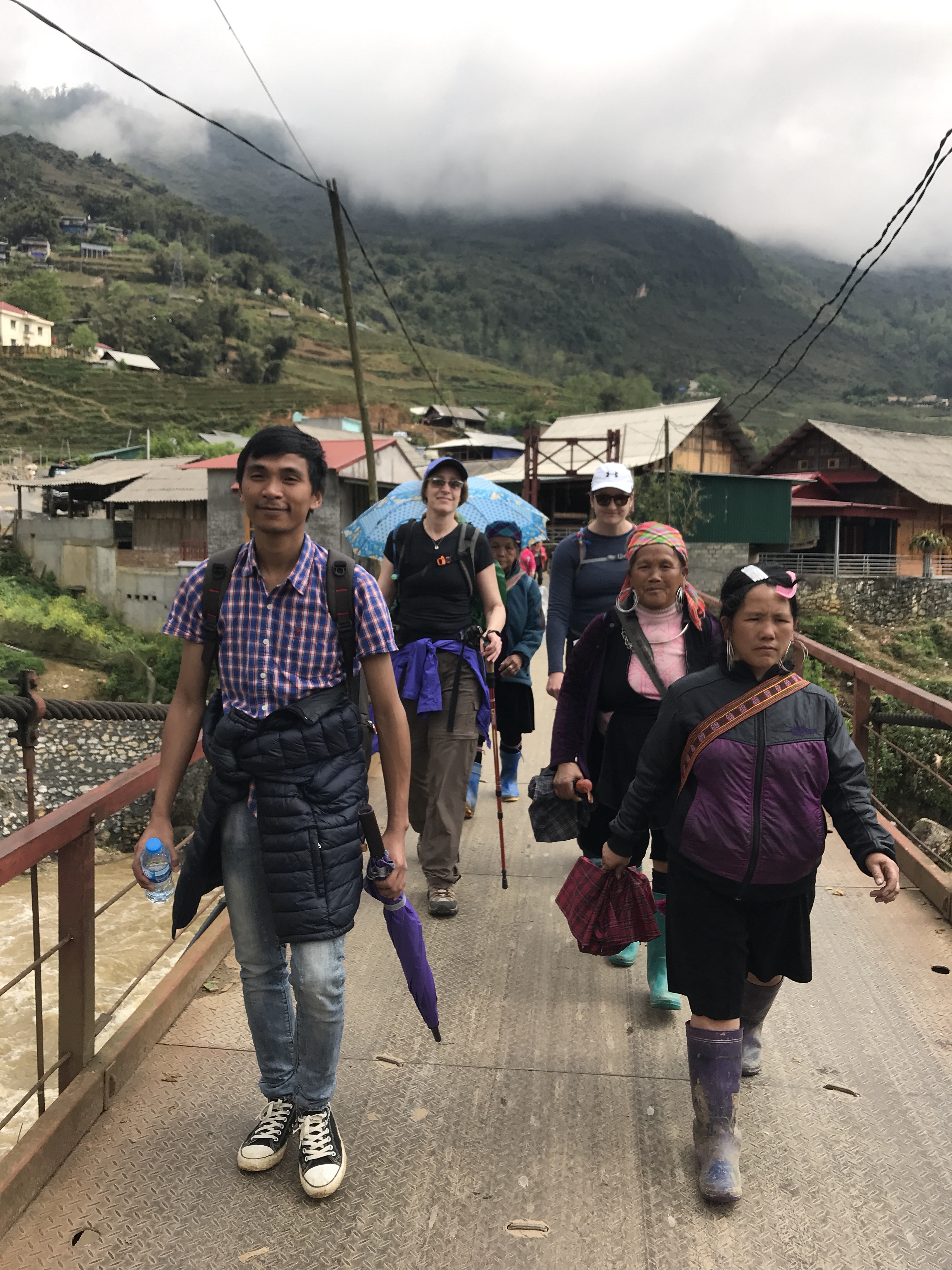 We start at the top of a village crossing a bridge over the river; to the left is Nga, our guide, Cat and Mandy back right