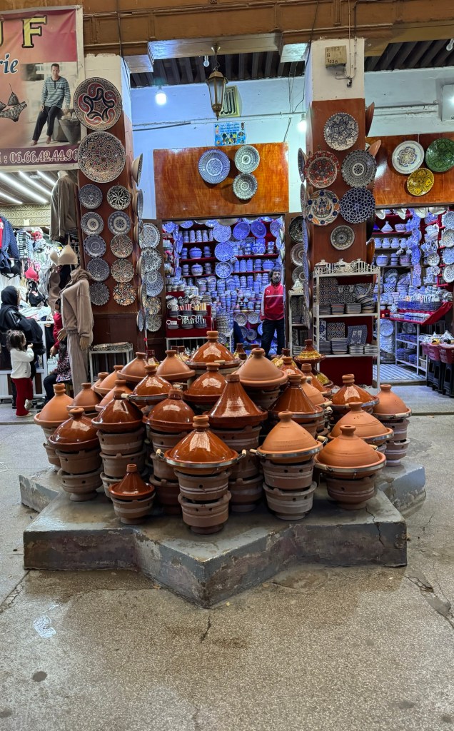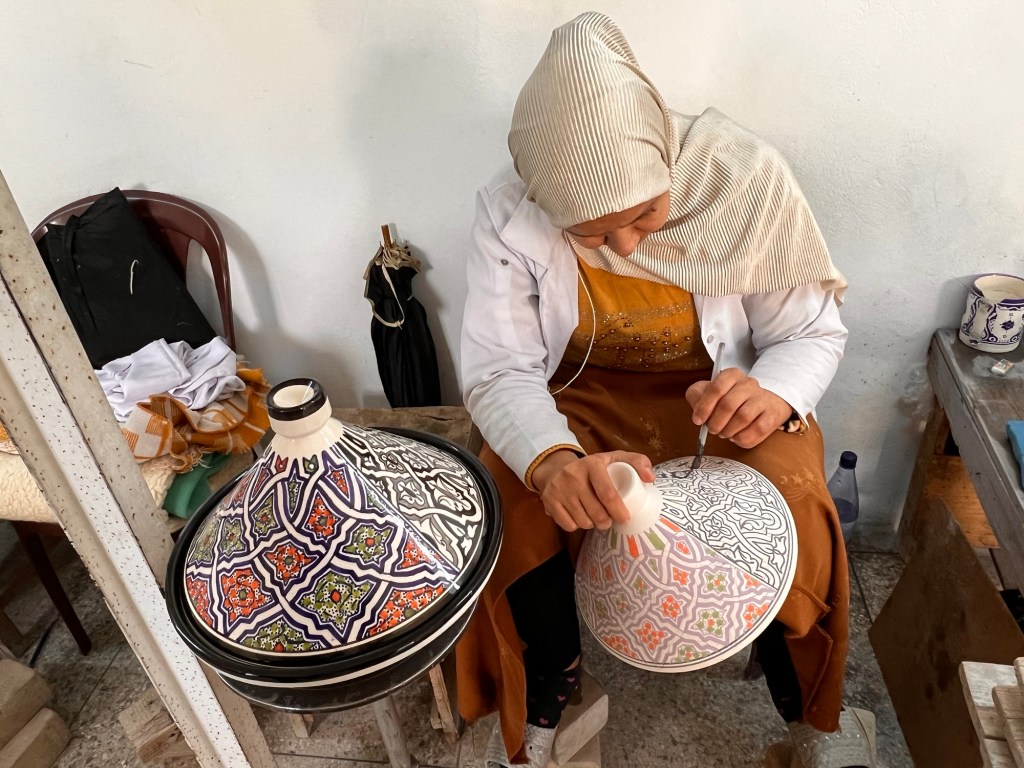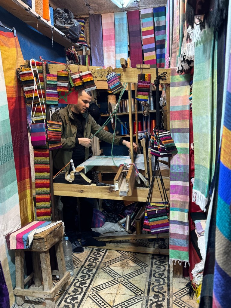 Fes is home to so many small talented artists such as woodcarvers, brass etching, weavers of silk fabric on wooden looms, ceramic artists, pottery makers, leather workshops the size of closets!